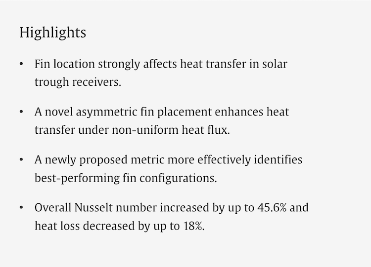 Vinod Kumar, Carlo Nonino, Stefano Savino,On the improvement of the thermal performance of longitudinally finned parabolic trough solar receivers,Applied Thermal Engineering,Volume 279, Part E,2025,127840,ISSN 1359-4311,https://doi.org/10.1016/j.applthermaleng.2025.127840